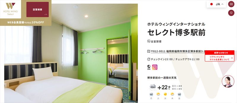 | ホテルウィングインターナショナルセレクト博多駅前 | ¥7,290〜 | ビジネスや観光に便利な立地 | JR博多駅から徒歩約4分 |