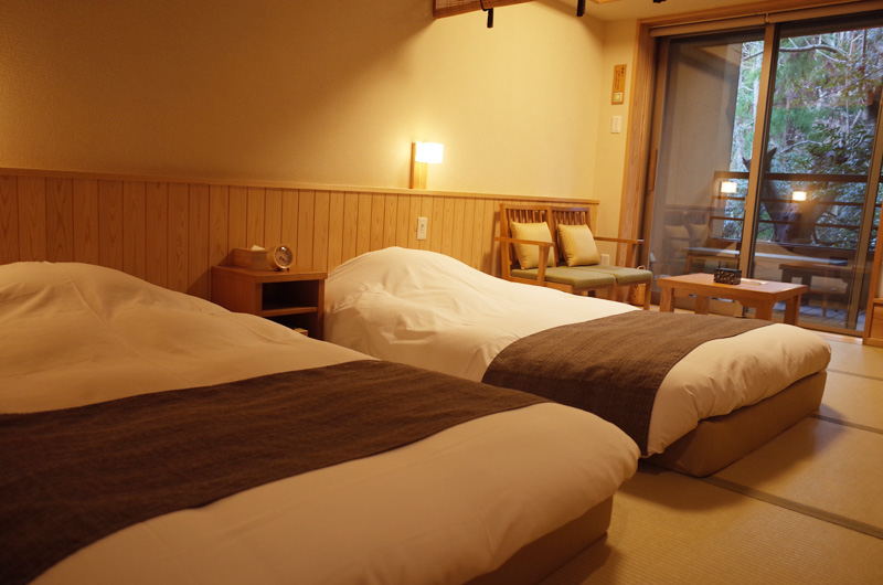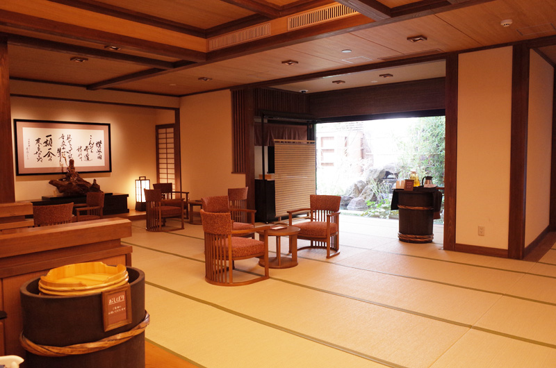 畳敷きの館内は素足で歩けて快適、天然温泉も完備。